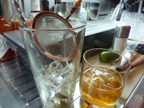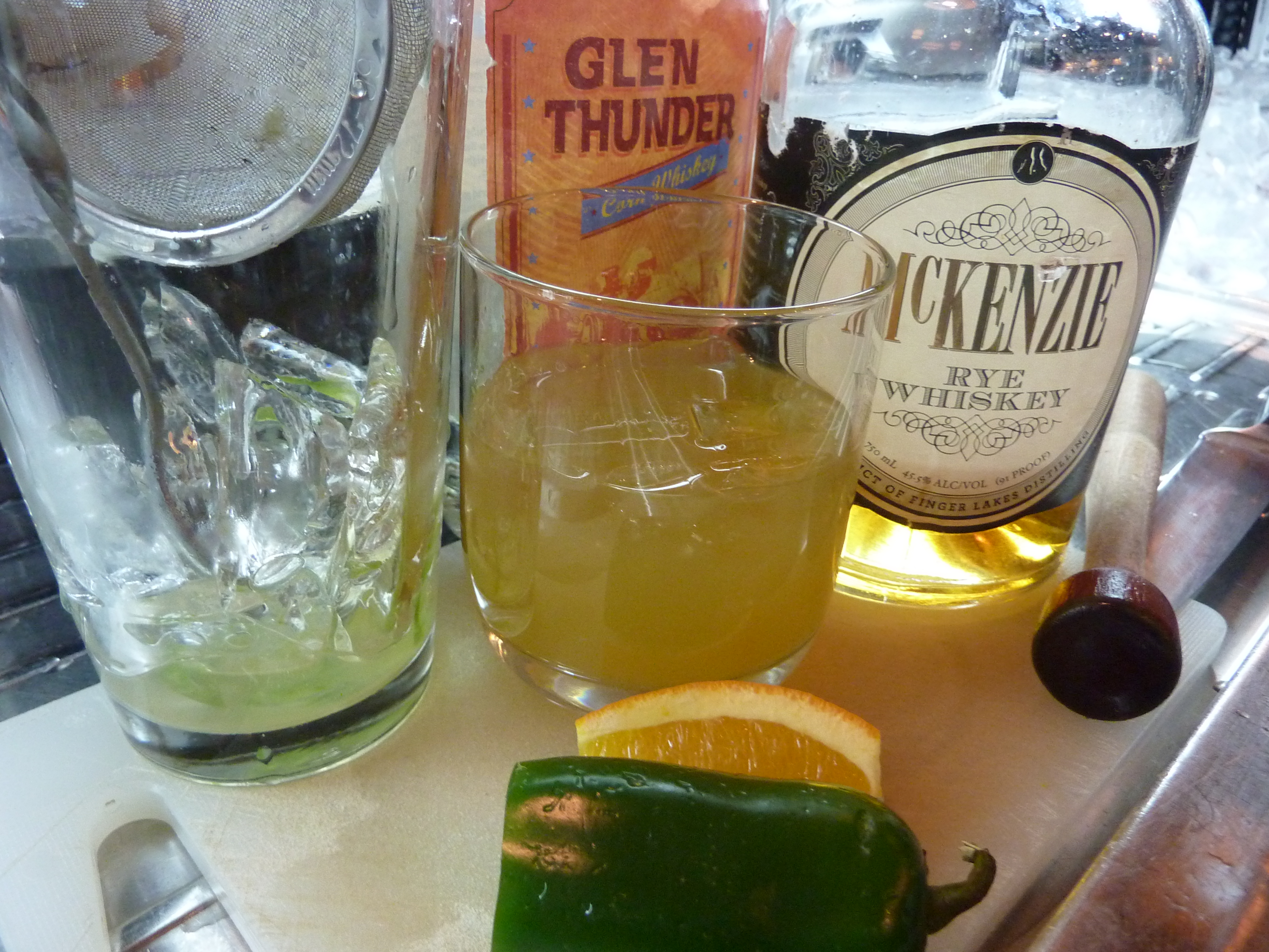 In a pint glass, I muddled 2 slices of jalapeños in simple syrup, added ice, 3 dashes Angostura bitters, 1 oz. McKenzie Rye, 1 oz. Glen Thunder, dash of salt and I stirred it and strained it into a rocks glass.