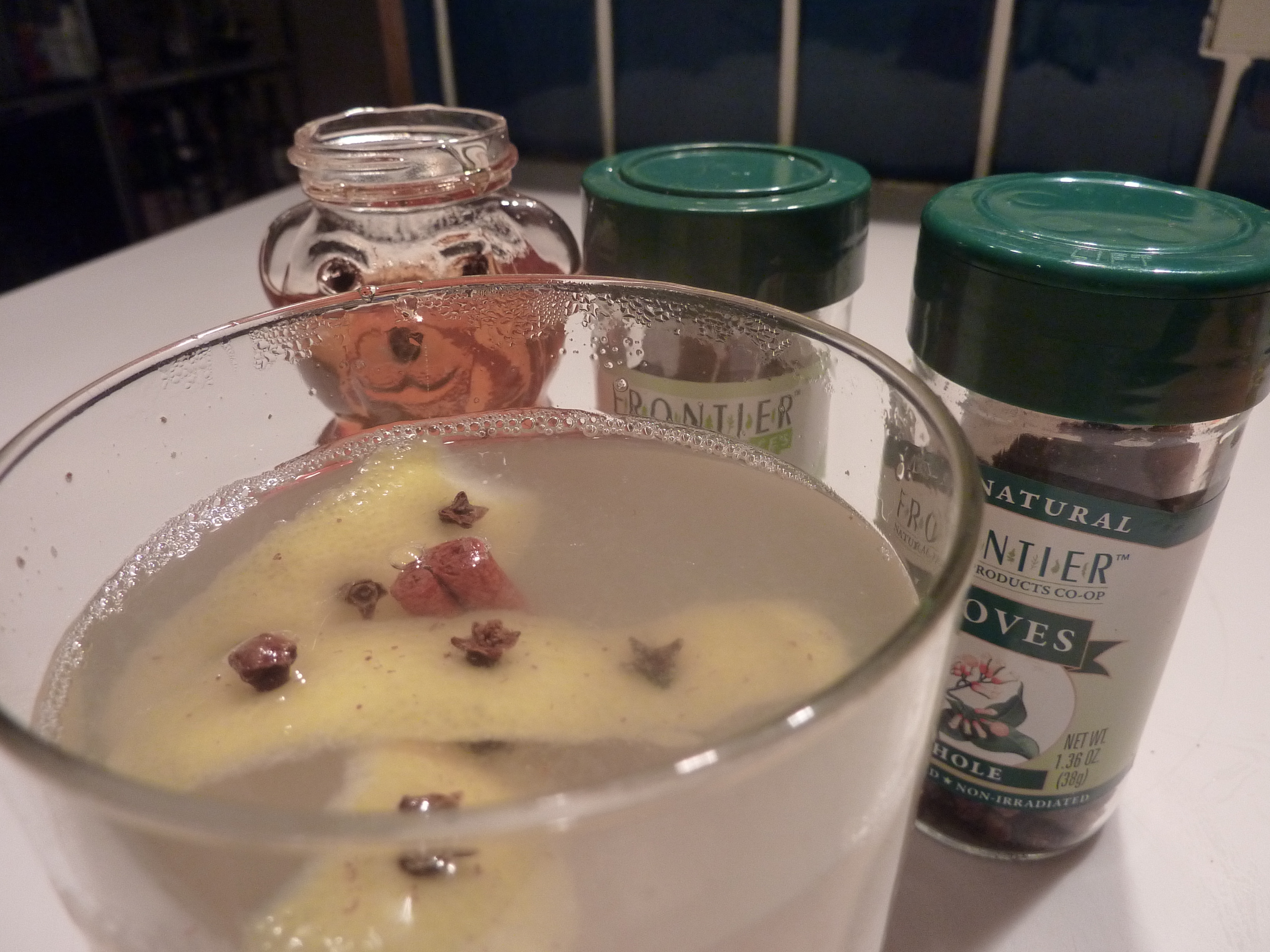 I put water on to boil, sliced 4 pieces of lemon peel and stuck whole cloves in them, dubbing them "clove soldiers".