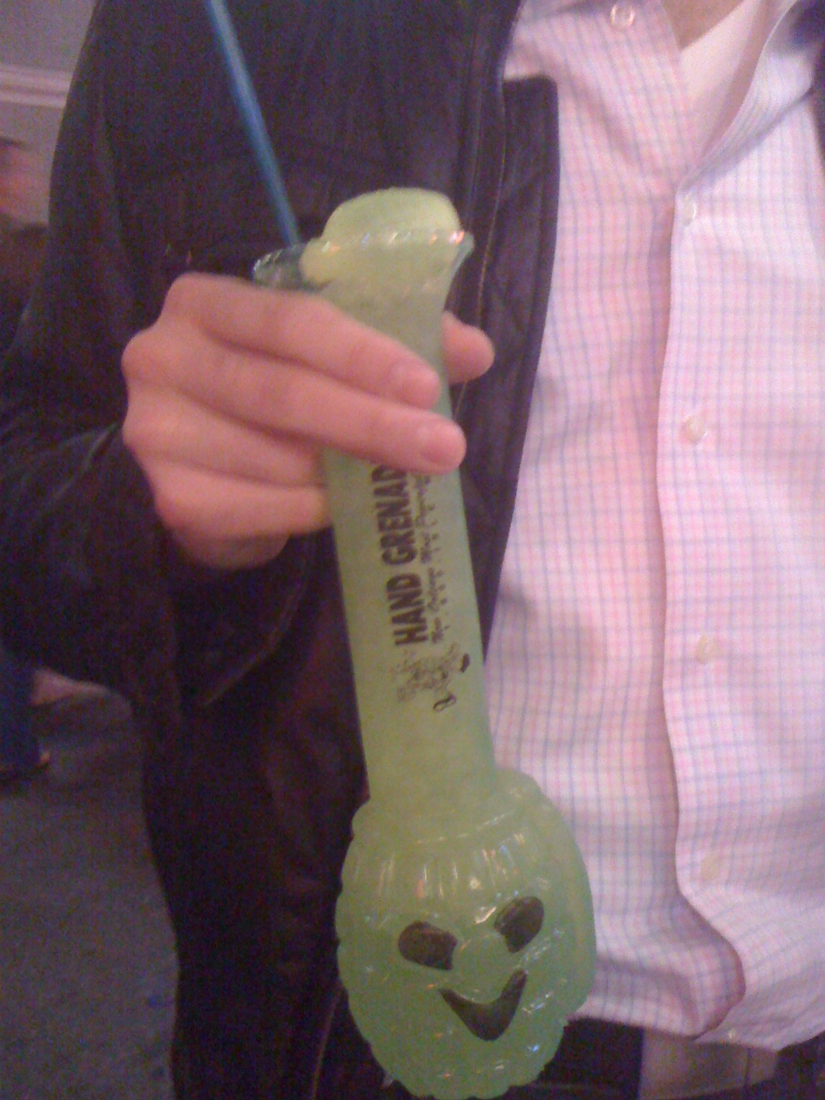 These "hand grenades" were all over town. The bright green is not from the cup, but rather it's the actual color of the drink. When I inquired about the drink, all the bartender would say was it's "melon-flavored" and the recipe is a secret (then he proceeded to fill the cup from a soda gun). The best part of this drink was the plastic grenade garnish.