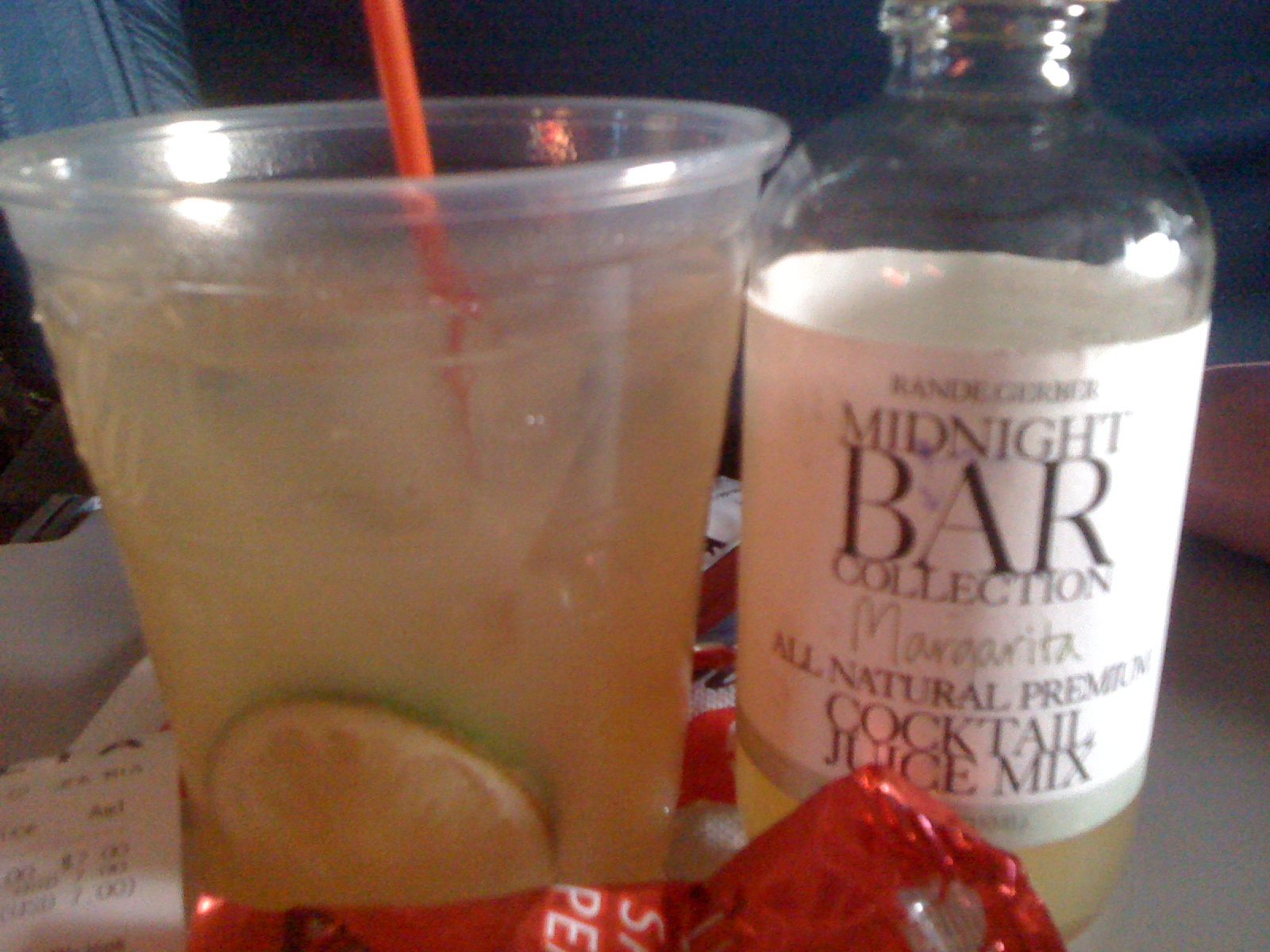 The cocktail featured Sauza gold and Rande Gerber’s “Midnight Bar Collection” margarita mix, bottled by Stirrings.  Gerber, a former model, is married to Cindy Crawford and runs the Midnight Oil/Gerber Group chain of bars and lounges (over 30 properties, including The Whiskey and Stone Rose Lounge in NYC).  He developed a line of cocktails for Delta in 2007.  This mixer had real lemon, lime and orange juice and was not overly sweet.