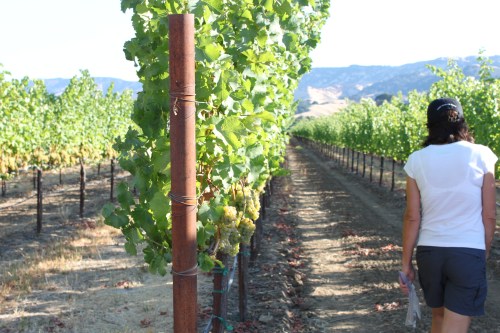 Following Kristin through one of Honig's Sauvignon Blanc vineyards. She wanted to test the sugar level, or Brix, in both her newer (approx. 6 yrs. old) and older (15-20 year old) vines in the Gordon Vineyard.