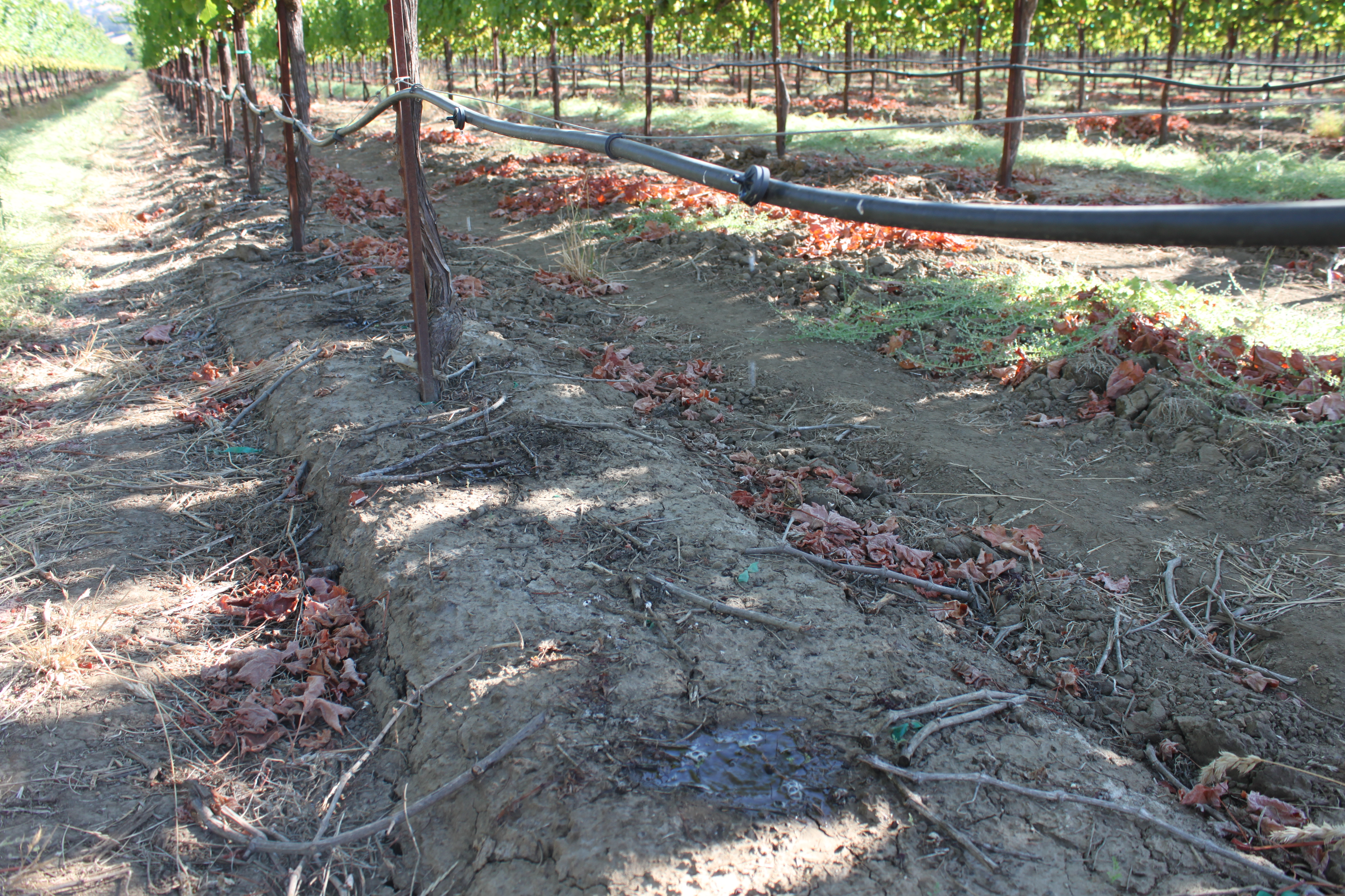 Since at least another day of the heat wave was expected, Kristin had her vineyard manager turn on the water. If you look carefully, you can see the drops beginning to emerge from the drip irrigation system.