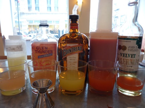 From left to right: Take 1 - following the corn tassel recipe, subbing Velvet Falernum and Angostura: too tart. Take 2 - dialing back on citrus, adding dash of salt and adding a bit more Velvet Falernum: eh. Take 3 - same as take 2, subbing orange juice for lemon juice: getting there. Take 4 - same as take 3, subbing blood orange juice for regular orange juice: almost there. Take 5: same as take 4, dropping blood orange juice to 1 oz. and adding 0.25 oz. lemon juice: bingo.
