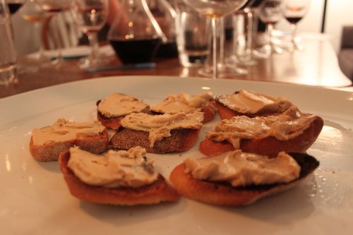 It would have been a lot of wine to have without any food to wash it down, but Chris, the ever-gracious host, had prepared a 4 course meal. Here's the first: foie mousse on toasted baguette. Didn't suck with the Sauternes.