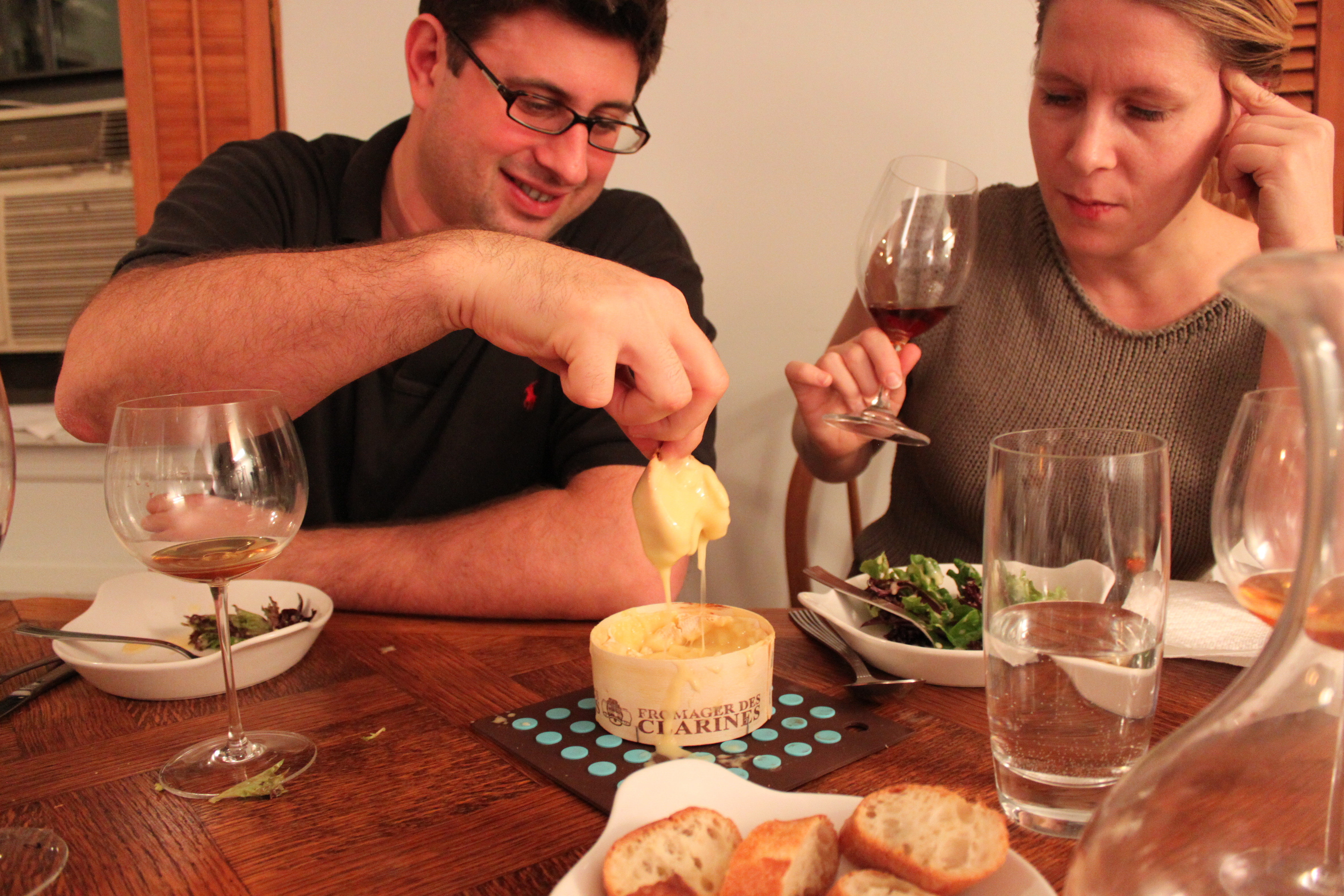 Course 3 was a washed rind cheese that Chris added 2 cloves of garlic and some Sauternes to and stuck in the oven. It came out a fragrant and gooey mess. The side salad was not enough to offset the amount of cheese and foie that we put away.