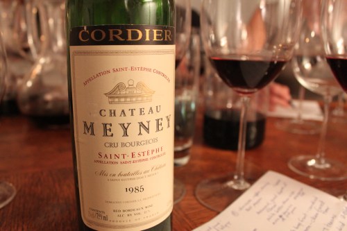 Chateau Meyney 1985. Dried cherries, anise, and brett in a good way. On the front palate, a slight bit of corkiness came through, but it wasn't necessarily unpleasant. I had guessed St. Julien 1987. Doh.