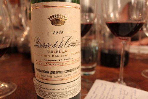 Wine #3, the Reserve de la Comtesse 1988, was the group favorite. Chocolate, coffee, cherry, bell pepper, tobacco; great balance and depth of flavor. The most structured of the bunch.