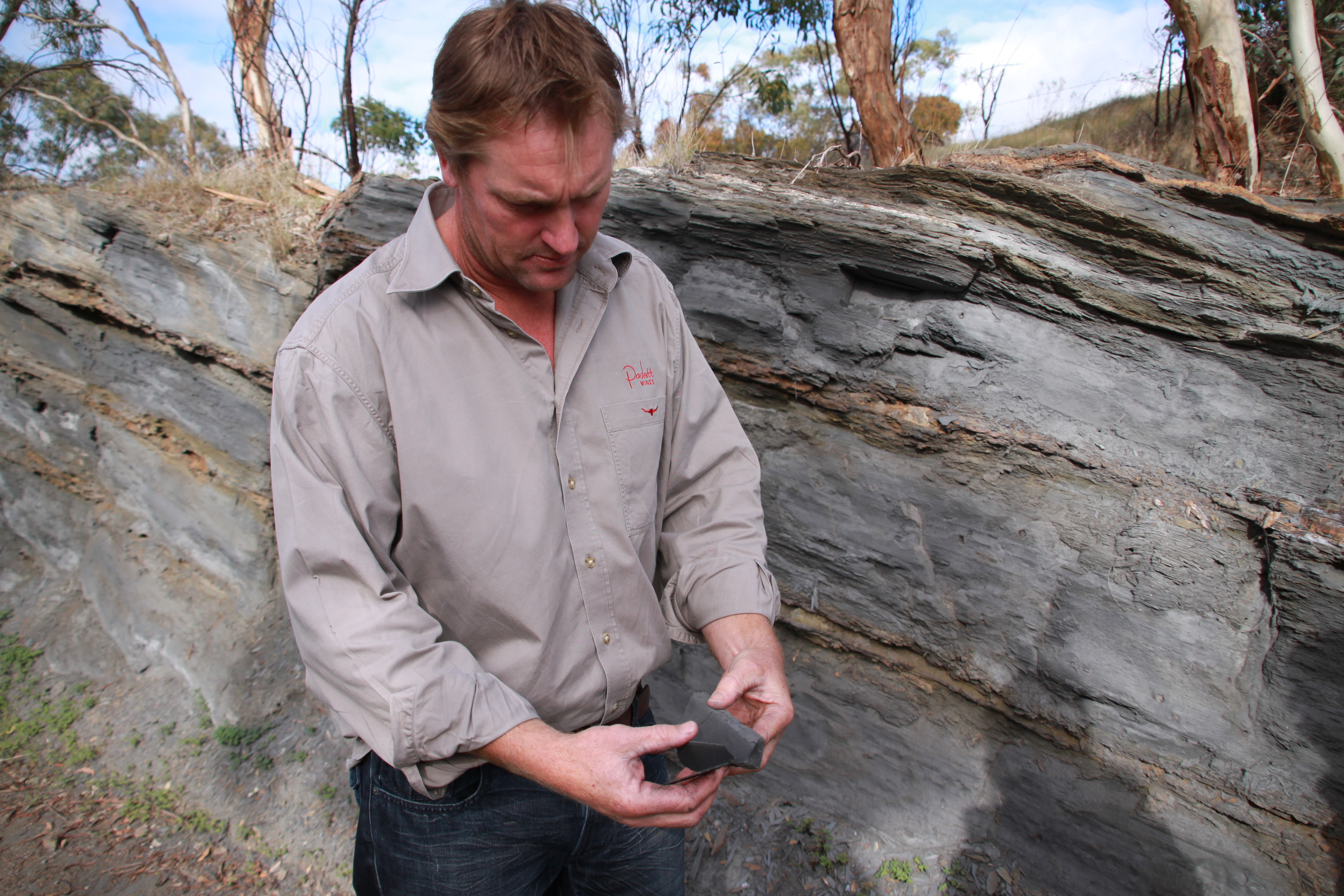 Winemaker from Paulett's with slate in his hands. Friable and plentiful, this soil contributes to the flavor of the Clare Valley Rieslings.