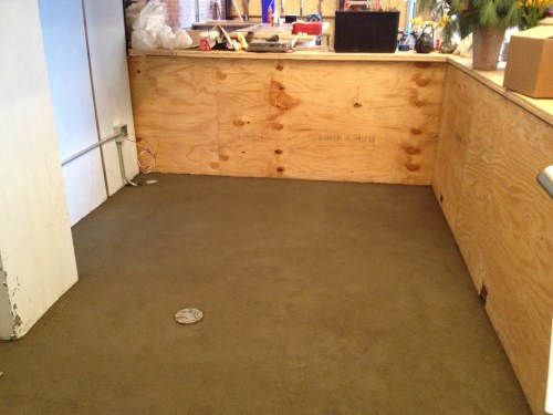 We poured the floors behind both bars. They've since been covered with grippy, waterproof epoxy. We'll be starting to move equipment in today!