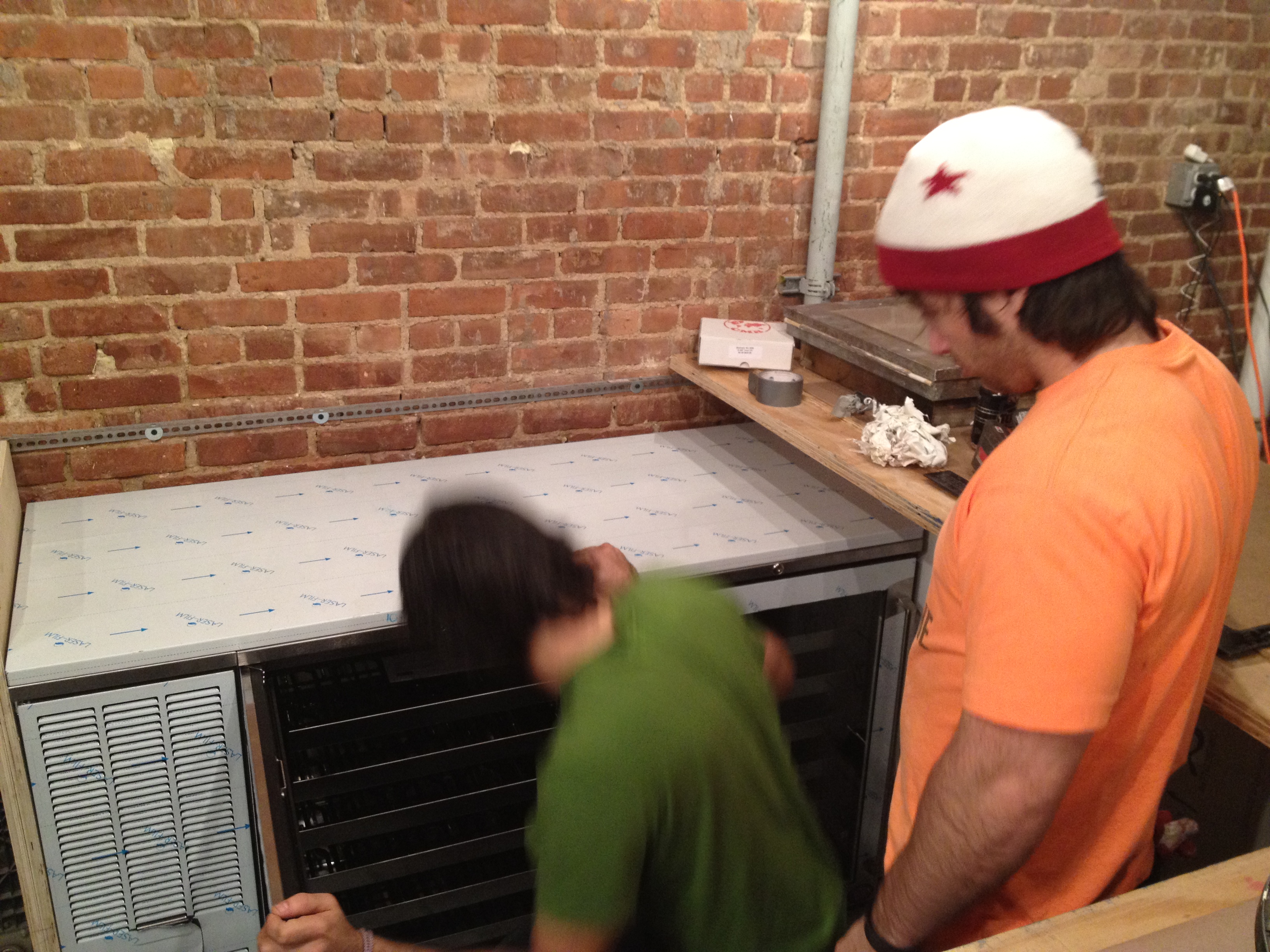 Fiddling with the plug on the back bar fridge, under Corey's supervision.